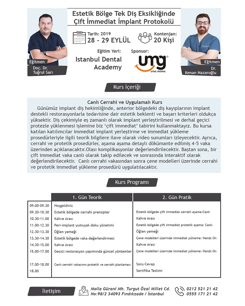 In today's implant dentistry, aesthetic expectations and success criteria for the treatment of tooth loss in anterior with implant supported restorations are quite high. The term 'immediate implant placement' is used for implant placement in the extraction socket simultaneously with tooth extraction, and 'immediate loading' is used for immediate support with a temporary prosthesis. Participants in the course will watch video presentations in addition to theoretical knowledge about immediate implant placement and immediate loading procedures. In addition, surgical and prosthetic procedures will be explained step by step through detailed documented cases. Possible complications will be evaluated. In live patient, tooth extraction, immediate implant placement, measurement and immediate temporary prosthesis loading will be followed, and questions will be answered interactively by the participants during the operation. On the first day, the surgical procedure will be explained theoretically, immediate implant placement surgery will be performed on the live patient, and then the implant will be applied on the plastic jaw model. On the second day, the prosthetic part will be explained theoretically, and the live patient will be loaded immediately, then the prosthetic loading will be done hands-on on the model. The training will be completed with a question-answer and certificate ceremony.