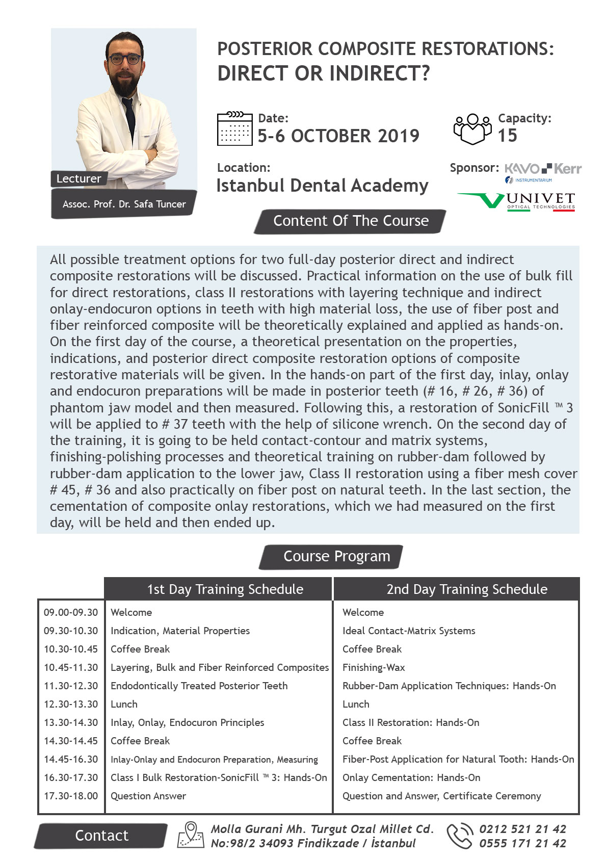All possible treatment options for two full-day posterior direct and indirect composite restorations will be discussed. Practical information on the use of bulk fill for direct restorations, class II restorations with layering technique and indirect onlay-endocuron options in teeth with high material loss, the use of fiber post and fiber reinforced composite will be theoretically explained and applied as hands-on. On the first day of the course, a theoretical presentation on the properties, indications, and posterior direct composite restoration options of composite restorative materials will be given. In the hands-on part of the first day, inlay, onlay and endocuron preparations will be made in posterior teeth (# 16, # 26, # 36) on phantom jaw model and then measured. Following this, a restoration of SonicFill ™ 3 will be applied to # 37 teeth with the help of silicone wrench. On the second day of the training, it is going to be held contact-contour and matrix systems, finishing-polishing processes and theoretical training on rubber-dam followed by rubber-dam application to the lower jaw, Class II restoration using a fiber mesh cover # 45, # 36 and also practically on fiber post on natural teeth. In the last section, the cementation of composite onlay restorations, which we had measured on the first day, will be held and then ended up.