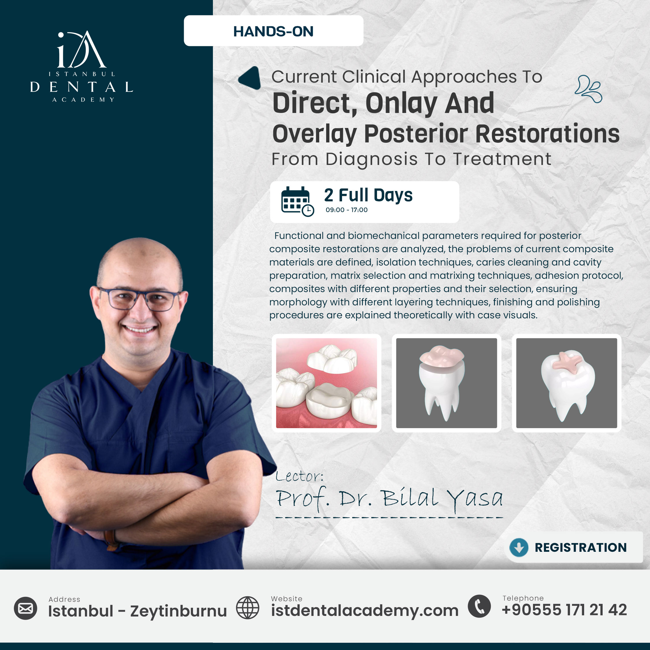The first day; functional and biomechanical parameters required for posterior composite restorations are analyzed, the problems of current composite materials are defined, isolation techniques, caries cleaning and cavity preparation, matrix selection and matrixing techniques, adhesion protocol, composites with different properties and their selection, ensuring morphology with different layering techniques, finishing and polishing procedures are explained theoretically with case visuals. After the theoretical training, rubber dam application is performed in the posterior region in hands-on part in a jaw model. Class II composite restoration withthelayeringtechnique in thejaw model is applied step by step from preparation to completion with its morphological features.